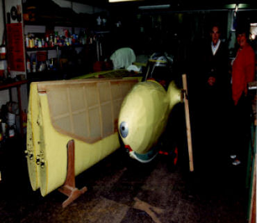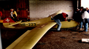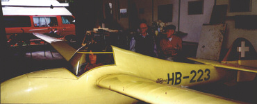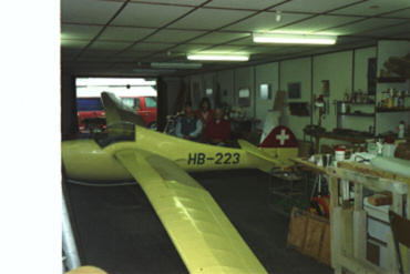 Hütter 28, HB-223, wird 2001 in Thörigen in der ehemaligen Werkstatt von Ruedi Sägesser, zwischengelagert.