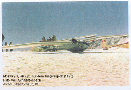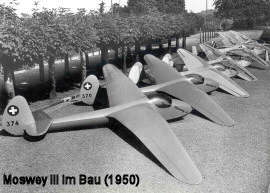 Sonstiges: | Insgesamt wurden 14 Moswey 3 gebaut. Bei der Segelflugweltmeisterschaft 1948 in Samedan, Schweiz / Engadin, belegte Alwin Kuhn, Schweiz, auf Moswey den dritten Rang unter 28 Teilnehmern aus 8 Nationen. Seinerzeit siegte Per-Axel Persson, Schweden, auf Weihe, vor Max Schachenmann, Schweiz, auf Air 100. |