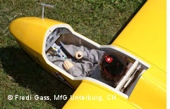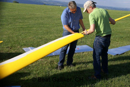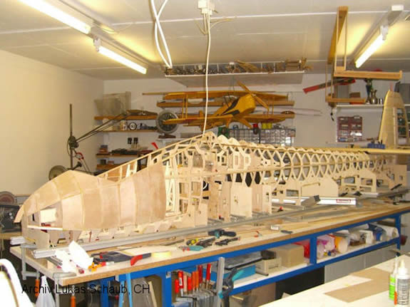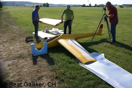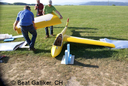 Gewichts ist der Aufbau eine "Gemeinschaftsaufgabe". Die Flächen sind pro Seite zweiteilig; der Rumpf aus Gewichtsgründen