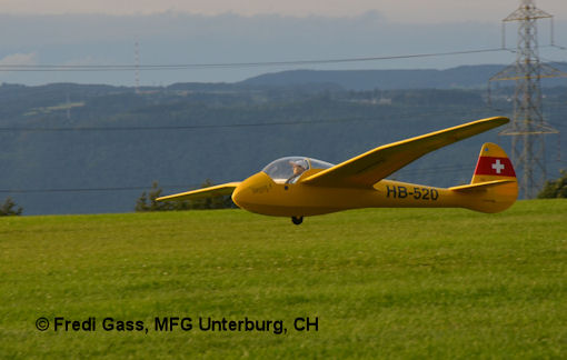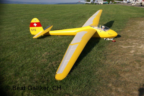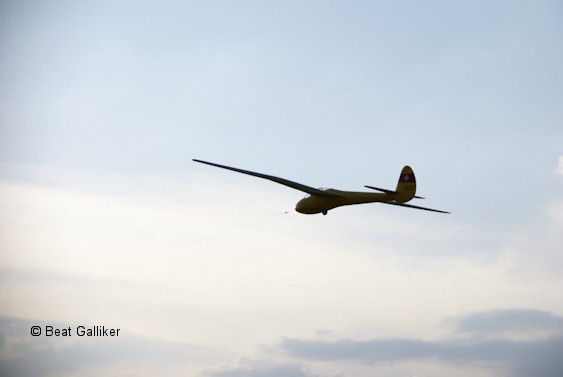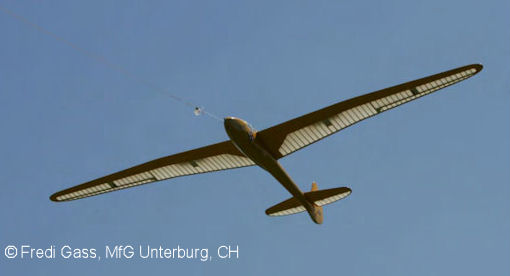 Das Modell in optimaler Fluglage beim Schlepp. Das Rad ist gefedert und hat eine Bremse.
