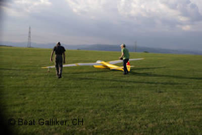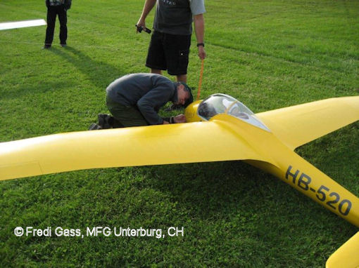 Test des Motors. Bei der Größe des Seglers und des damit verbundenen Gewichts sind natürlich ein erfahrener Schlepppilot,
