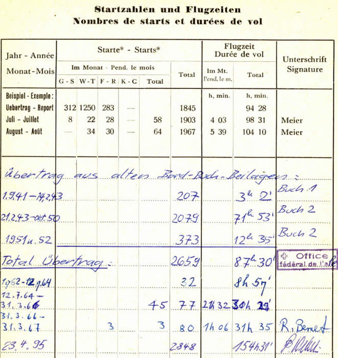 Bordbuch des S-Kranich, HB-330. Die große Anzahl der Starts resultiert hauptsächlich aus dem